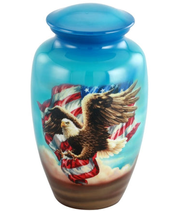 This beautifully handcrafted urn presents the American Eagle and Flag theme.