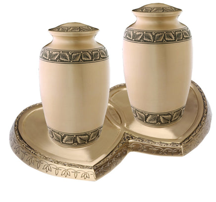 This companion urn set is made of genuine solid brass and the heart base is beautifully hand crafted from genuine solid brass. The companion urns have a top-openings with secure threaded lids and felt bottom.