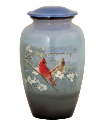 This beautifully handcrafted urn presents the Cardinal and Flowering Dogwood theme.