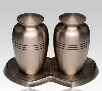 This companion urn set is made of genuine solid brass and the heart base is beautifully hand crafted from genuine solid brass. The companion urns have a top-openings with secure threaded lids and felt bottom.