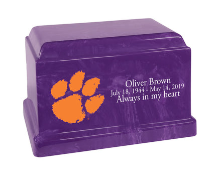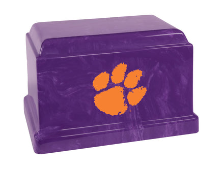 This Clemson Tigers Cultured Marble Memorial urn is a rectangular urn made of stone, resin and color pigments. Due to the manufacturing process and variations in the materials used, each may differ in appearance than the photo shown. The ash compartment can be accessed via a threaded plug on the bottom side of the urn. This urn meets the guidelines for most cemeteries for ground burial, without need for a separate vault.