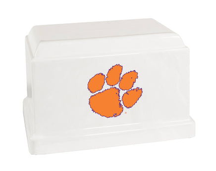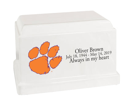 This Clemson Tigers Cultured Marble Memorial urn is a rectangular urn made of stone, resin and color pigments. Due to the manufacturing process and variations in the materials used, each may differ in appearance than the photo shown. The ash compartment can be accessed via a threaded plug on the bottom side of the urn. This urn meets the guidelines for most cemeteries for ground burial, without need for a separate vault.