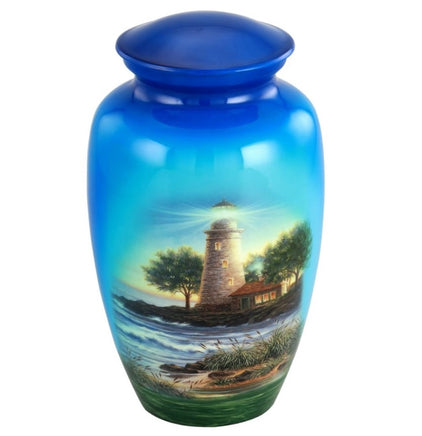 This beautifully handcrafted urn presents the Oceanside Lighthouse theme.