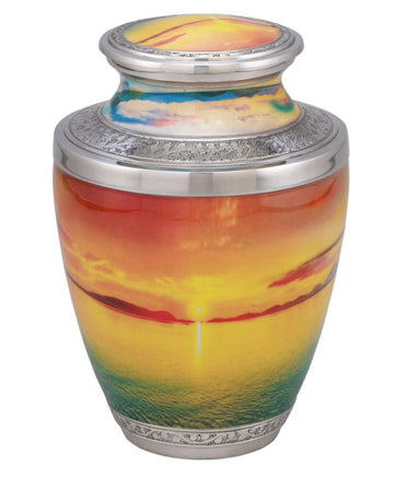 This beautifully handcrafted urn presents the ocean sunset theme.