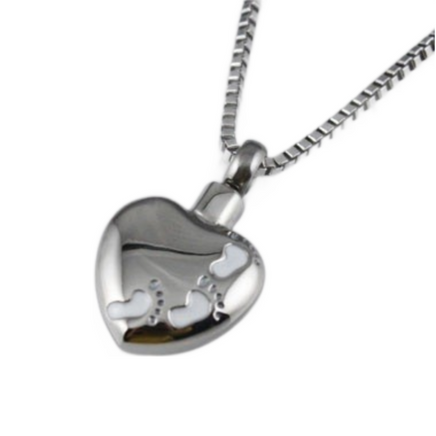 This Cremation Pendant is made of stainless steel and created by artist jewelers. The quality is incomparable and the craftsmanship outstanding. This Keepsake footprints Pendant can hold a small amount of the cremation ashes or a piece of hair to memorialize your loved one forever. You can keep your loved one close to your heart at all times. Includes top opening screw and a FREE 21" snake chain.