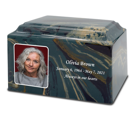 Custom photo printed cultured marble urns. These fine classic shaped urns are made with the best cultured marble rocks carved and colored to perfection. The range is presented in series of different colors to suit the taste and style of the beholder of the marble memoir.