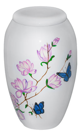 Hand Painted Butterflies in Flight CREMATION URN. The urn is made from solid metal and the perfect lacquer coat to preserve its brilliance. It comes with top opening with a threaded lid and felt bottom. The hand painted artwork is uniquely handcrafted for each urn to show beautiful detail giving the FUNERAL URN a unique look to each finished product. Our urns are handcrafted uniquely by an ancient process called sand casting.