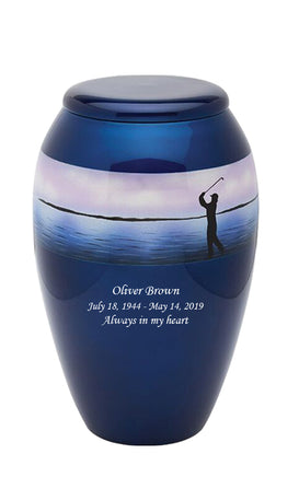 Hand Painted Golfer CREMATION URN . The urn is made from solid metal and the perfect lacquer coat to preserve its brilliance. It comes with top opening with a threaded lid and felt bottom. The hand painted artwork is uniquely handcrafted for each urn to show beautiful detail giving the FUNERAL URN a unique look to each finished product. Our urns are handcrafted uniquely by an ancient process called sand casting.