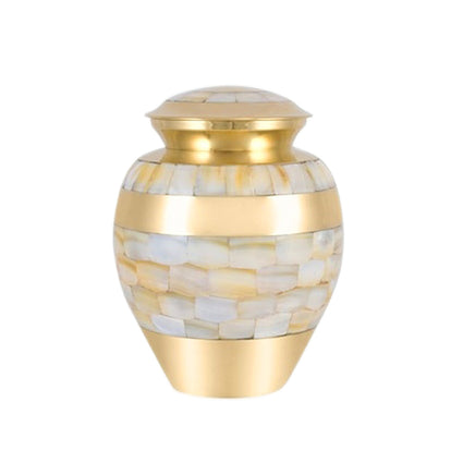 This Infant Urn is finished in Gold and Nickel overlay with beautifully designed mother of pearls all around. The urn is made from solid brass and the perfect lacquer coat to preserve its brilliance. It comes with a top opening, a threaded lid, and a felt bottom.