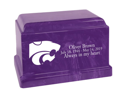 This Kansas State Wildcats Cultured Marble Memorial urn is a rectangular urn made of stone, resin and color pigments. Due to the manufacturing process and variations in the materials used, each may differ in appearance than the photo shown. The ash compartment can be accessed via a threaded plug on the bottom side of the urn. This urn meets the guidelines for most cemeteries for ground burial, without need for a separate vault.