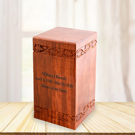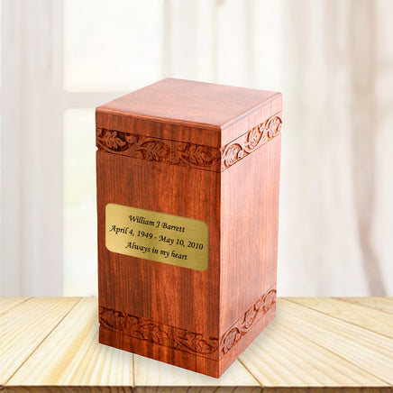 This Beautiful Rosewood Urn is carefully hand-carved to provide an elegant look and to conserve your precious memories.