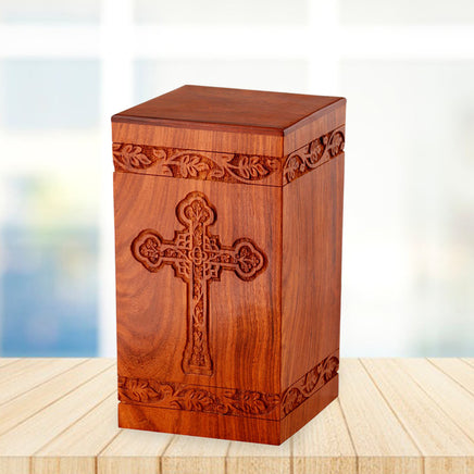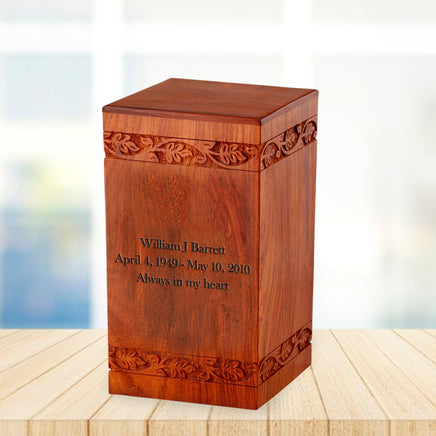 This Beautiful Rosewood Urn is carefully hand-carved to provide an elegant look and to conserve your precious memories.