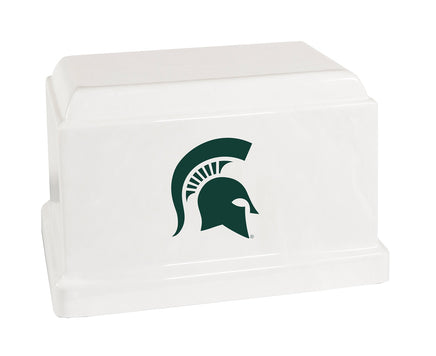 This Michigan State Spartans Cultured Marble Memorial urn is a rectangular urn made of stone, resin and color pigments. Due to the manufacturing process and variations in the materials used, each may differ in appearance than the photo shown. The ash compartment can be accessed via a threaded plug on the bottom side of the urn. This urn meets the guidelines for most cemeteries for ground burial, without need for a separate vault.
