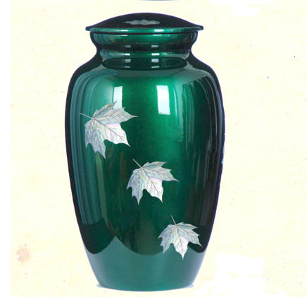 Mother of Pearl Falling Leaf on Green CREMATION URN. The urn is made from solid metal and the perfect lacquer coat to preserve its brilliance. It comes with a top opening, a threaded lid, and felt bottom. The Green finish with Inlaid Mother of Pearl Filler are uniquely handcrafted for each urn to show beautiful detail giving the FUNERAL URN a unique look to each finished product. Our urns are handcrafted uniquely by an ancient process called sand casting.