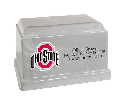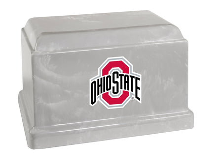 This Ohio State Buckeyes Cultured Marble Memorial urn is a rectangular urn made of stone, resin and color pigments. Due to the manufacturing process and variations in the materials used, each may differ in appearance than the photo shown. The ash compartment can be accessed via a threaded plug on the bottom side of the urn. This urn meets the guidelines for most cemeteries for ground burial, without need for a separate vault.
