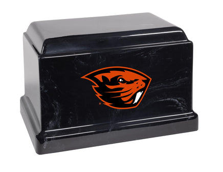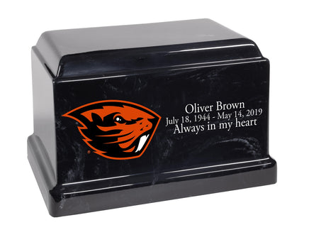 This Oregon State Beavers Cultured Marble Memorial urn is a rectangular urn made of stone, resin and color pigments. Due to the manufacturing process and variations in the materials used, each may differ in appearance than the photo shown. The ash compartment can be accessed via a threaded plug on the bottom side of the urn. This urn meets the guidelines for most cemeteries for ground burial, without need for a separate vault.