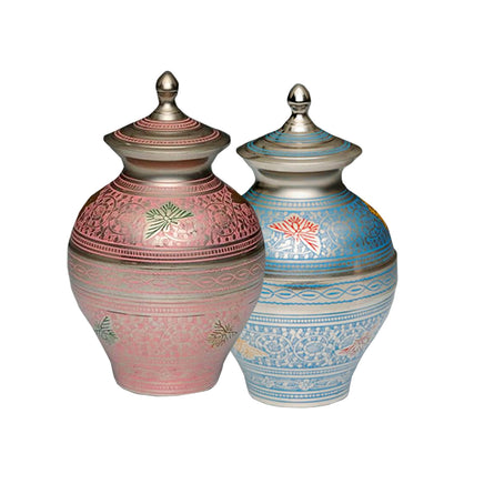 This Pink or Blue Butterfly Infant Urn is finished in baby pink color and nickel overlay with beautifully designed butterfly. The urn is made from solid brass and the perfect lacquer coat to preserve its brilliance. It comes with top opening with a threaded lid and felt bottom.