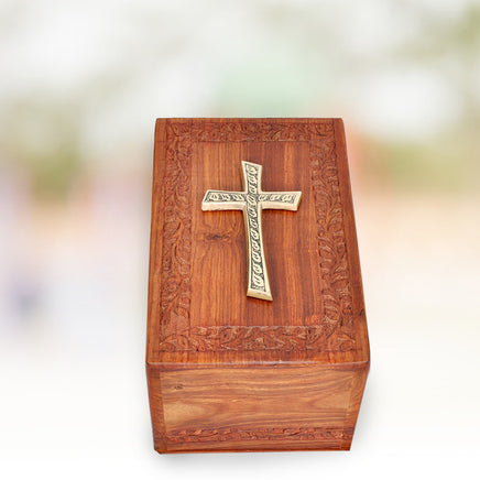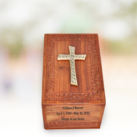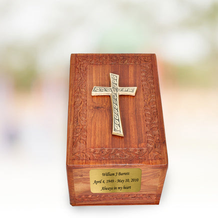 This Beautiful Rosewood Urn is carefully hand-carved to provide an elegant look and to conserve your precious memories. The cross applique adds an elegant and unique look to the urn.