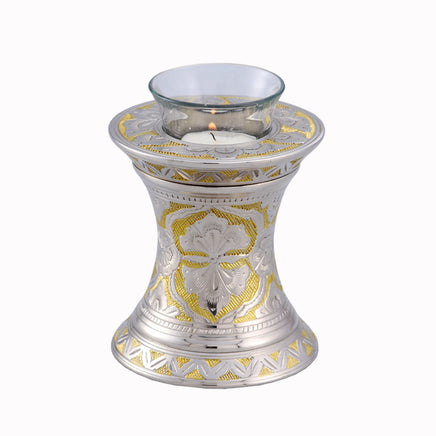Infinityurn’s Silver and Gold is an elegant and affordable Tea Light SMALL CREMATION URN. The Tealight urn is made from solid Brass and the perfect lacquer coat to preserve its brilliance. It comes with a top opening, a threaded lid for ashes, and a small candle holding space.