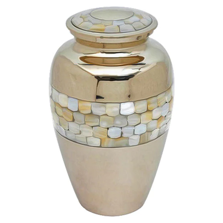 This Simple Mother of Pearl Urn is finished in gold and nickel overlay with beautifully designed pearls. The urn is made from solid brass and the perfect lacquer coat to preserve its brilliance. It comes with a top opening, a threaded lid, and felt bottom.