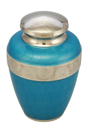 This Sparta Sky Blue Cremation Urn is finished in Blue and Silver color. The urn is made from solid brass and the perfect lacquer coat to preserve its brilliance. It comes with a top opening, a threaded lid, and felt bottom.