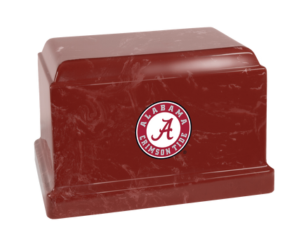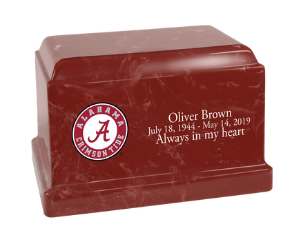 This Alabama Crimson Tide Cultured Marble Memorial urn is a rectangular urn made of stone, resin and color pigments. Due to the manufacturing process and variations in the materials used, each may differ in appearance than the photo shown. The ash compartment can be accessed via a threaded plug on the bottom side of the urn. This urn meets the guidelines for most cemeteries for ground burial, without need for a separate vault.