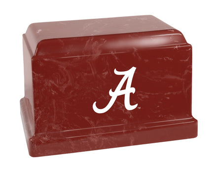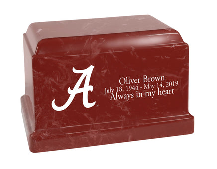 This Alabama Crimson Tide Cultured Marble Memorial urn is a rectangular urn made of stone, resin and color pigments. Due to the manufacturing process and variations in the materials used, each may differ in appearance than the photo shown. The ash compartment can be accessed via a threaded plug on the bottom side of the urn. This urn meets the guidelines for most cemeteries for ground burial, without need for a separate vault.