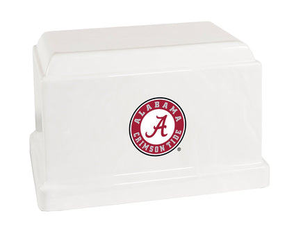This Alabama Crimson Tide Cultured Marble Memorial urn is a rectangular urn made of stone, resin and color pigments. Due to the manufacturing process and variations in the materials used, each may differ in appearance than the photo shown. The ash compartment can be accessed via a threaded plug on the bottom side of the urn. This urn meets the guidelines for most cemeteries for ground burial, without need for a separate vault.