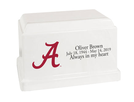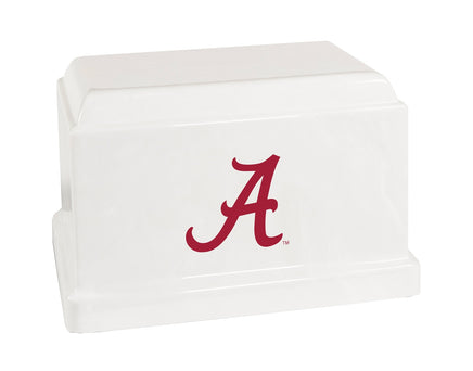 This Alabama Crimson Tide Cultured Marble Memorial urn is a rectangular urn made of stone, resin and color pigments. Due to the manufacturing process and variations in the materials used, each may differ in appearance than the photo shown. The ash compartment can be accessed via a threaded plug on the bottom side of the urn. This urn meets the guidelines for most cemeteries for ground burial, without need for a separate vault.