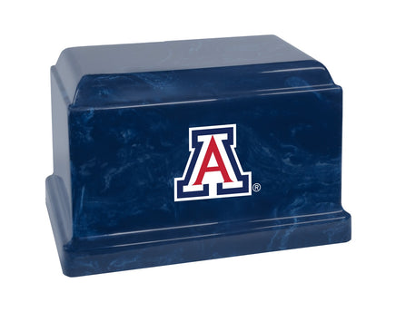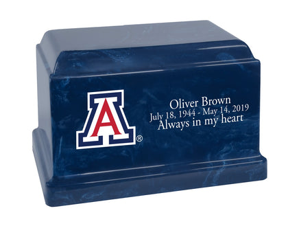This Arizona Wildcats Cultured Marble Memorial urn is a rectangular urn made of stone, resin and color pigments. Due to the manufacturing process and variations in the materials used, each may differ in appearance than the photo shown. The ash compartment can be accessed via a threaded plug on the bottom side of the urn. This urn meets the guidelines for most cemeteries for ground burial, without need for a separate vault.