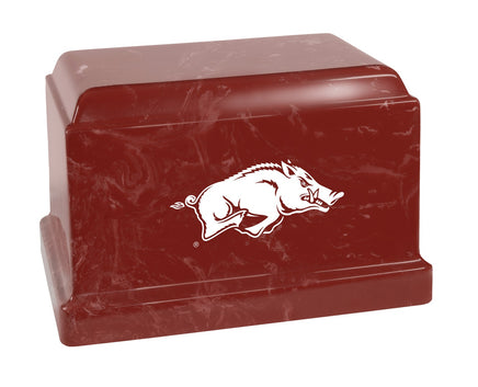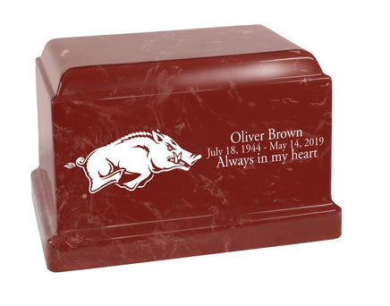 This Arkansas Razorbacks Cultured Marble Memorial urn is a rectangular urn made of stone, resin and color pigments. Due to the manufacturing process and variations in the materials used, each may differ in appearance than the photo shown. The ash compartment can be accessed via a threaded plug on the bottom side of the urn. This urn meets the guidelines for most cemeteries for ground burial, without need for a separate vault.
