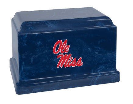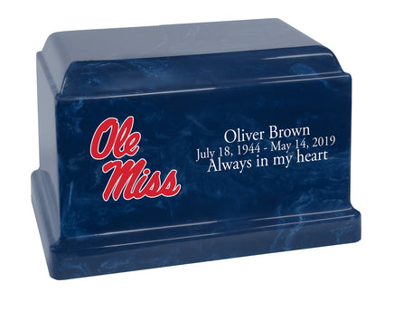 This Ole Miss Rebels Cultured Marble Memorial urn is a rectangular urn made of stone, resin and color pigments. Due to the manufacturing process and variations in the materials used, each may differ in appearance than the photo shown. The ash compartment can be accessed via a threaded plug on the bottom side of the urn. This urn meets the guidelines for most cemeteries for ground burial, without need for a separate vault.