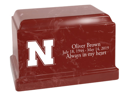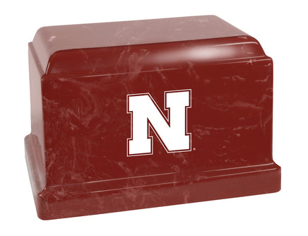 This Nebraska Cornhuskers Cultured Marble Memorial urn is a rectangular urn made of stone, resin and color pigments. Due to the manufacturing process and variations in the materials used, each may differ in appearance than the photo shown. The ash compartment can be accessed via a threaded plug on the bottom side of the urn. This urn meets the guidelines for most cemeteries for ground burial, without need for a separate vault.