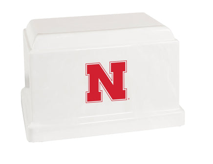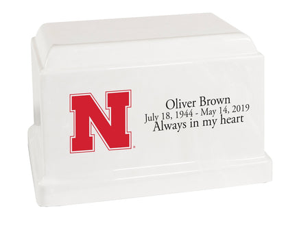 This Nebraska Cornhuskers Cultured Marble Memorial urn is a rectangular urn made of stone, resin and color pigments. Due to the manufacturing process and variations in the materials used, each may differ in appearance than the photo shown. The ash compartment can be accessed via a threaded plug on the bottom side of the urn. This urn meets the guidelines for most cemeteries for ground burial, without need for a separate vault.