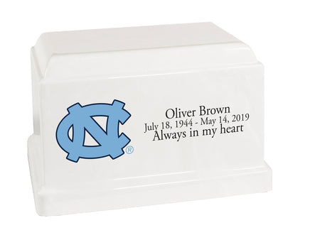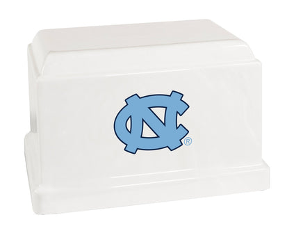 This North Carolina Tar Heels Cultured Marble Memorial urn is a rectangular urn made of stone, resin and color pigments. Due to the manufacturing process and variations in the materials used, each may differ in appearance than the photo shown. The ash compartment can be accessed via a threaded plug on the bottom side of the urn. This urn meets the guidelines for most cemeteries for ground burial, without need for a separate vault.