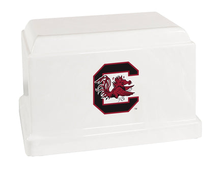 This South Carolina Gamecocks Cultured Marble Memorial urn is a rectangular urn made of stone, resin and color pigments. Due to the manufacturing process and variations in the materials used, each may differ in appearance than the photo shown. The ash compartment can be accessed via a threaded plug on the bottom side of the urn. This urn meets the guidelines for most cemeteries for ground burial, without need for a separate vault.