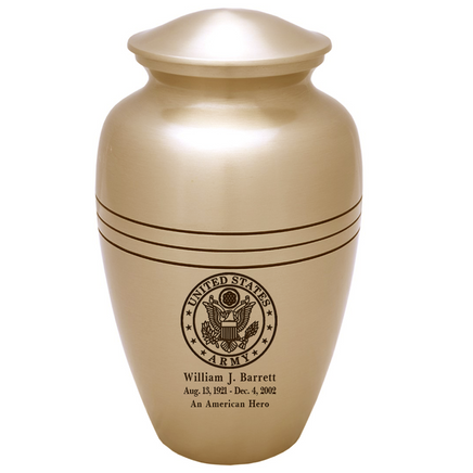 This Classic Gold Cremation Urn is made of solid brass and has a brushed finish. This urn features an engraved military logo. Perfect for a military funeral service, or patriotic soul.
