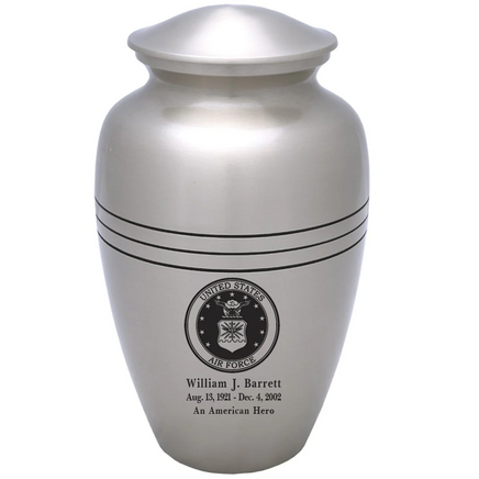 This Classic Pewter Cremation Urn is made of solid brass and has a brushed finish. This urn features an engraved military logo. Perfect for a military funeral service, or patriotic soul.