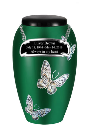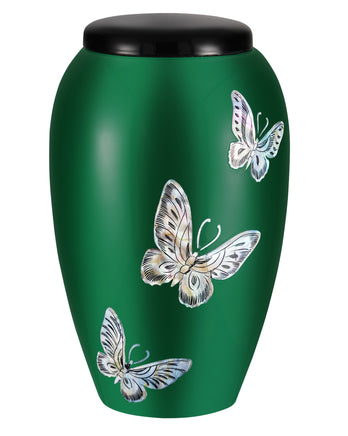 The Shell Art Series - Green Avian Butterfly Cremation Flat Top urn is made from fiberglass with Mother of Pearl inlaid Butterflies. It has got the perfect lacquer coat to preserve its brilliance. It comes with a top opening with a secured lid. The Green finish with Inlaid Mother of Pearl Filler are uniquely handcrafted for each urn to show beautiful detail giving the FUNERAL URN a unique look to each finished product.