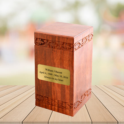 This Beautiful Rosewood Urn is carefully hand-carved to provide an elegant look and to conserve your precious memories.