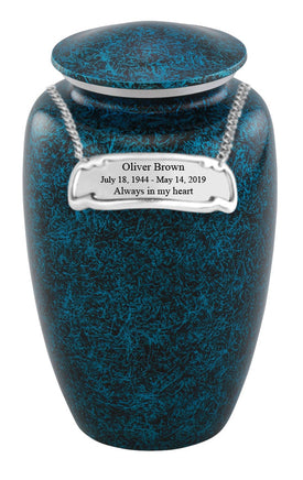 This Classic Value Cyan Urn is a Genuine Hand-crafted product ensuring each urn is UNIQUE and DURABLE, as well as ECONOMIC. Classic Value Cyan Urn fits the remains of most adults weighing up to 200 lbs. The urn is made from solid metal and the perfect lacquer coat to preserve its brilliance. It comes with top opening with a threaded lid and felt bottom.