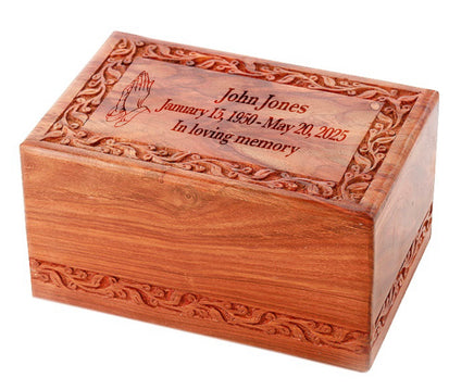 This Beautiful Rosewood Urn is carefully hand-carved to provide an elegant look and to conserve your precious memories.