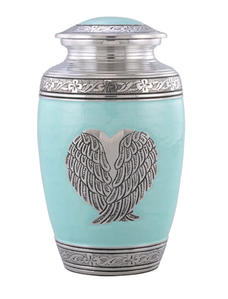 Each Angel Series Urn features an engraved angel wings guarding your loved one in an urn made of metal. It is handmade for a unique look to each one made. This urn comes with a threaded lid and a felt bottom.