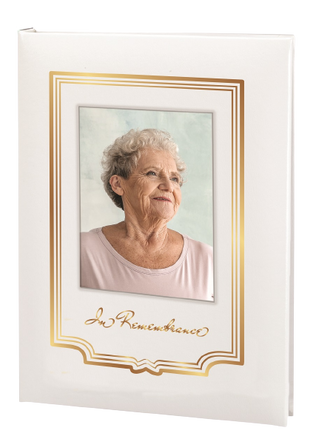 Our Artistic Picture Frame Funeral Guest Book features a decorated frame design. “In Remembrance” text and frame are stamped in gold foil. The window serves as a display for a standard 4”x6” photograph which slides into a secure pocket on the inside cover of the guest book. The Rectangle Photo Funeral Guest Book would be the perfect choice for those looking to display an image of their loved one.