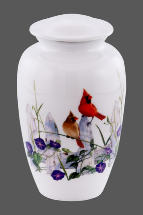 This beautifully handcrafted urn presents the Cardinal on Fence theme.