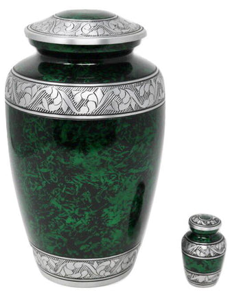 The Classic Forest Green with Silver Bands Cremation Urn is finished in Green color. The urn is made from solid metal and the perfect lacquer coat to preserve its brilliance. It comes with a top opening, a threaded lid, and felt bottom.