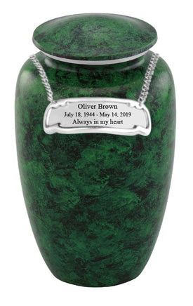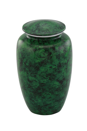 This Classic Value Green Urn is a Genuine Hand-crafted product ensuring each urn is UNIQUE and DURABLE, as well as ECONOMIC. Classic Value Green Urn fits the remains of most adults weighing up to 200 lbs. The urn is made from solid metal and the perfect lacquer coat to preserve its brilliance. It comes with top opening with a threaded lid and felt bottom.