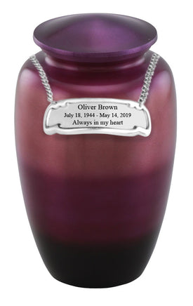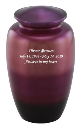 This Classic Value Pink Ombre Urn is a Genuine Hand-crafted product ensuring each urn is UNIQUE and DURABLE, as well as ECONOMIC. Classic Value Pink Ombre Urn fits the remains of most adults weighing up to 200 lbs. The urn is made from solid metal and the perfect lacquer coat to preserve its brilliance. It comes with top opening with a threaded lid and felt bottom.