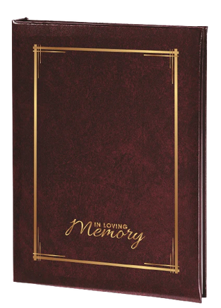 Our Decorative "In Loving Memory" Funeral Guest Book features a artistic design. “In Loving Memory” text and a border are stamped in gold foil. This Funeral Guest Book is available in a multitude of colors – Black, Burgundy, Green, Navy Blue and White.