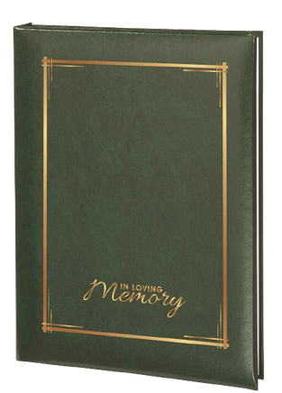 Our Decorative "In Loving Memory" Funeral Guest Book features a artistic design. “In Loving Memory” text and a border are stamped in gold foil. This Funeral Guest Book is available in a multitude of colors – Black, Burgundy, Green, Navy Blue and White.